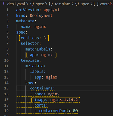 하단의 스펙에서는 유지할 레플리카 개수부터 파드 내의 컨테이너 스펙까지 지정한다. matchLabels는 파드를 식별할 때 사용하는 라벨로, 해당 라벨에 매칭된 파드의 개수를 지속적으로 파악한다. template > metadata > labels는 생성되는 파드에 설정할 라벨이며, 이 라벨이 matchLabels와 다르지 않도록 유의한다.