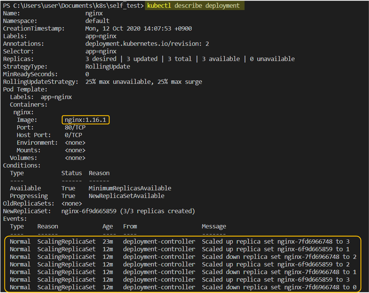 디플로이먼트 구성과 이벤트에 대해 좀 더 상세히 확인하려면 describe 명령어를 사용한다. 이미지가 새롭게 지정한 버전으로 업데이트 되었고, 레플리카의 스케일 업/다운 진행과정은 하단에 이벤트란에서 확인 가능하다.