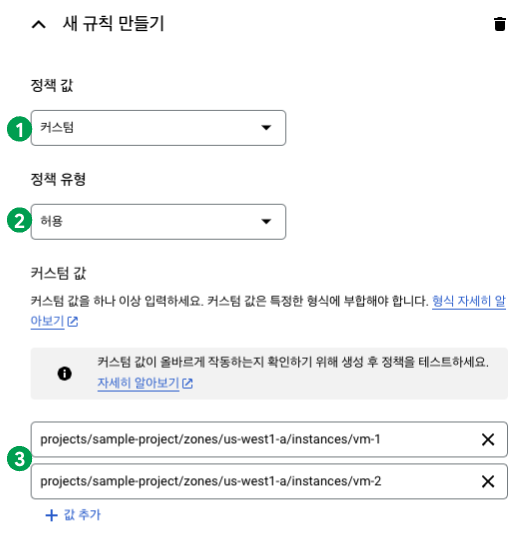 (3) 커스텀 값은 인스턴스의 경로를 입력하는데 projects/PROJECT_ID/zones/ZONE/instances/INSTANCE 형식이며, 이름은 정확히 매칭되어야 합니다.