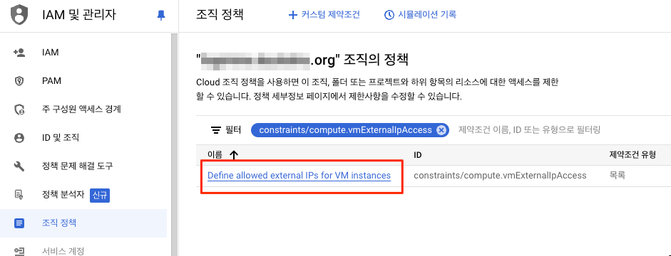 [ IAM > 조직정책 ] 페이지로 이동하여 constraints/compute.vmExternalIpAccess 정책을 검색합니다.