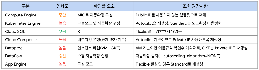 조직 정책이 적용되어 있을 때 이미 Public IP를 사용하도록 설정된 서비스가 있을 때 어떤 문제가 발생하는지 테스트했고, 각 서비스별로 어떤 설정들을 확인해봐야 하고 어떤 조치를 취해야 하는지 아래 표로 간단히 정리했습니다.