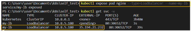 포트포워딩 설정으로는 로컬장비에서만 접속이 가능하므로, 실제 서비스처럼 인터넷을 통해 접속하려면 해당 파드를 외부로 노출시키는 설정이 필요하다. 이 때 사용하는 것이 Loadbalancer 서비스 이다.